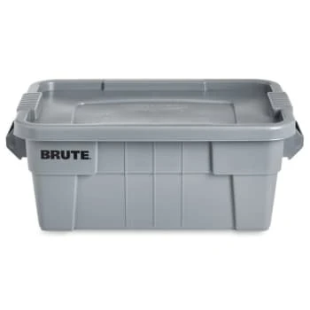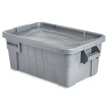 - Brute storage tote with lid. Lid snaps tight, keeping contents secure. Handles with drain holes prevent bacteria build-up. Ergonomic grip handles decrease the potential of back injury and finger strain, and provide convenient mobility. Reinforced ribbed bottom allows product to drag. Made of commercial grade material to withstand heavy-duty use. Totes stack securely for efficient use of space. NSF approved.